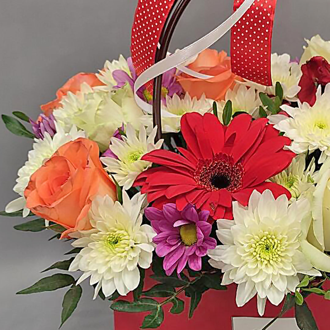 Корзиночка с цветами "Ариэль" из кустовой хризантемы, кустовой розы и альстромерии арт. 6975