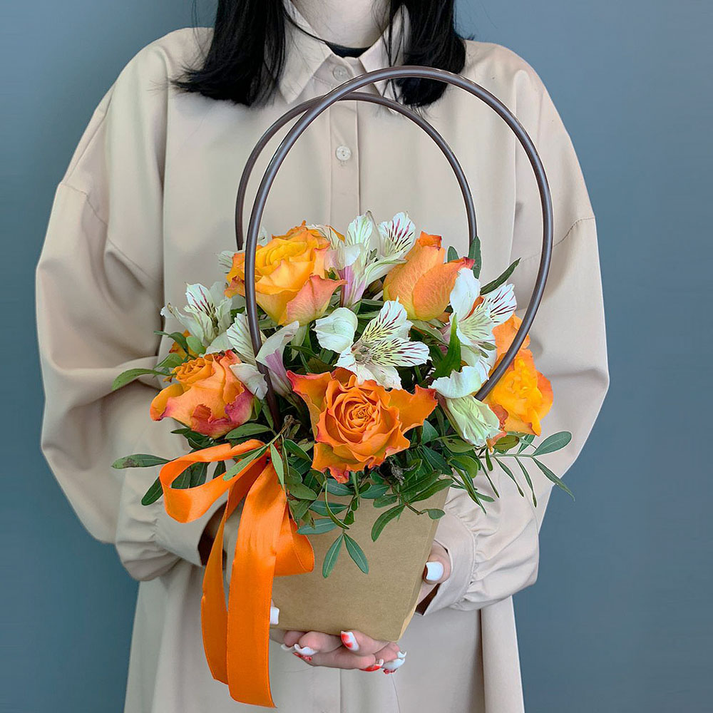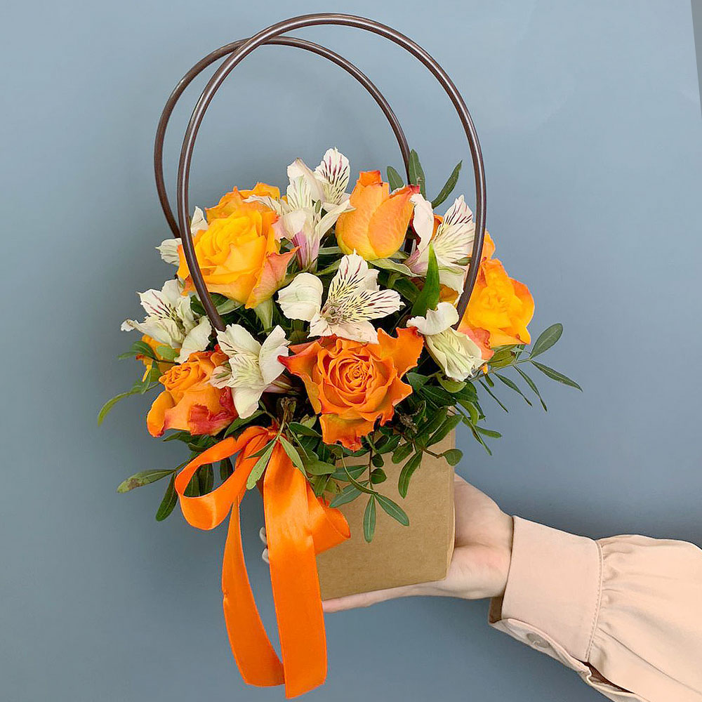 Коробка с розами "Заряд бодрости" оранжевый Кенийский микс №6991-Ор