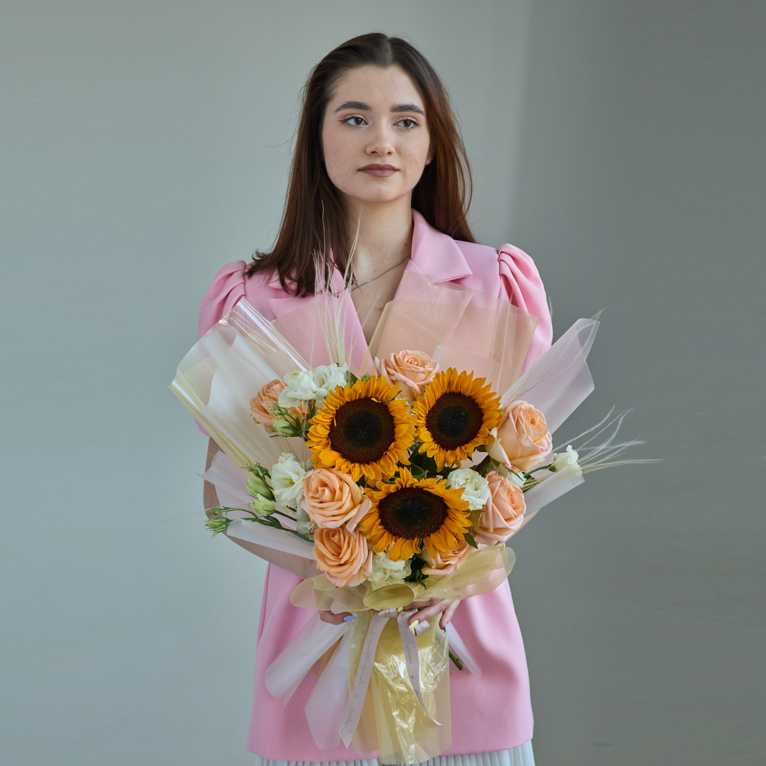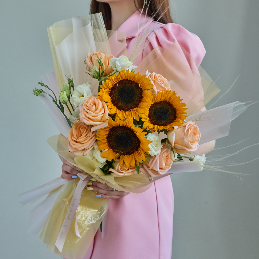 Этот букет с подсолнухами идеально подойдёт на день рождения, в качестве подарка для любимого человека или как яркий акцент на 1 сентября для старшеклассников. Осенняя гамма придаёт композиции тёплый и жизнерадостный характер, а сочетание крупных и нежных цветов делает её универсальной для разных случаев. Он производит впечатление живого, солнечного подарка, наполненного позитивной энергией.
