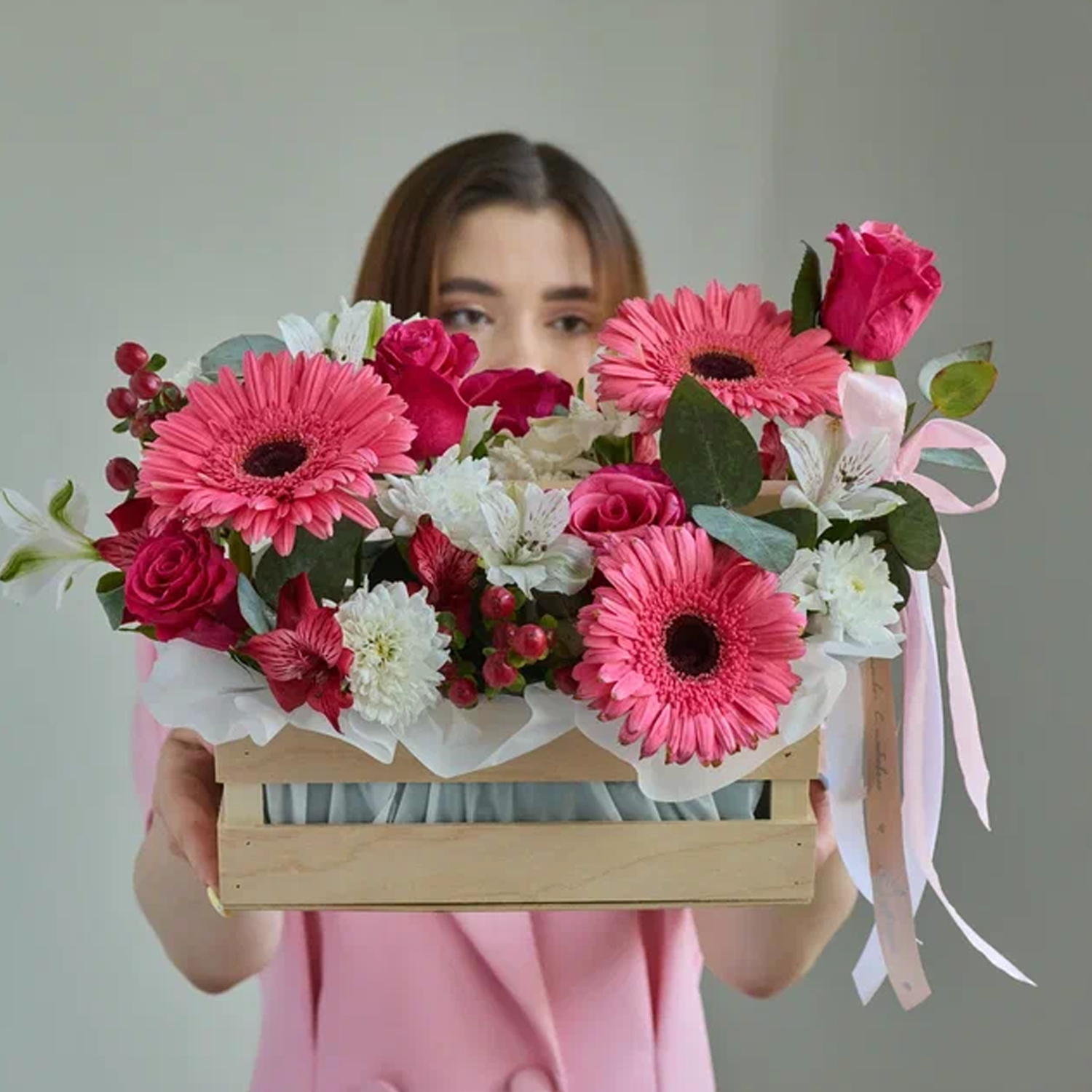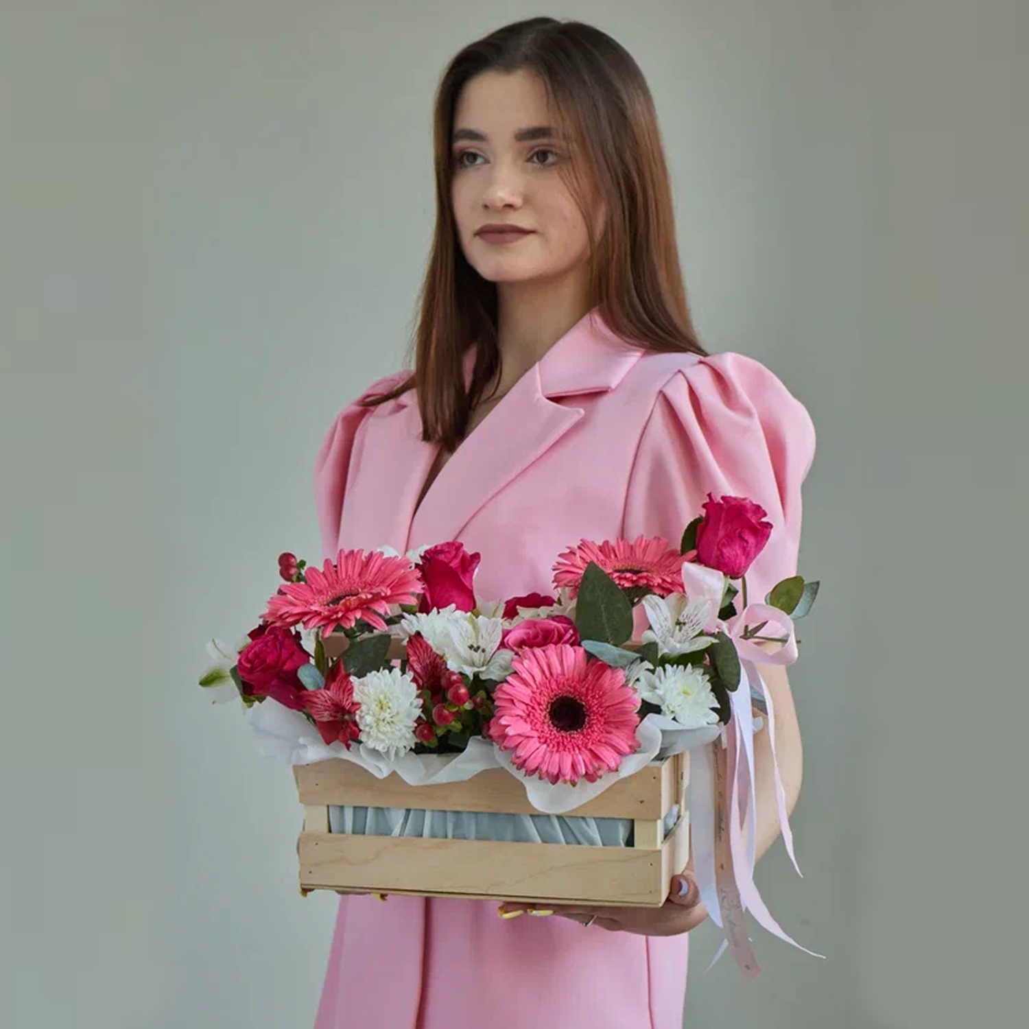 • Ящик с цветами "Свидание с ангелом" из роз и эустомы арт. 7753